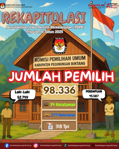 KPU Kabupaten Pegunungan Bintang telah menetapkan hasil Pemutakhiran Data Pemilih Berkelanjutan (PDPB) Triwulan III Tahun 2025 dengan total Pemilih Aktif sebanyak 98.336 orang, terdiri dari: