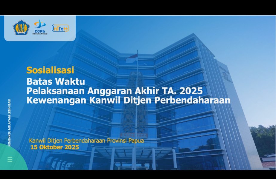 Kementerian Keuangan melalui Kantor Wilayah Direktorat Jenderal Perbendaharaan (DJPb) Provinsi Papua melaksanakan kegiatan Sosialisasi Batas Waktu Pelaksanaan Anggaran Akhir Tahun 2025, yang diikuti oleh seluruh satuan kerja di wilayah Papua, termasuk KPU Kabupaten Pegunungan Bintang, secara daring melalui Zoom Meeting.