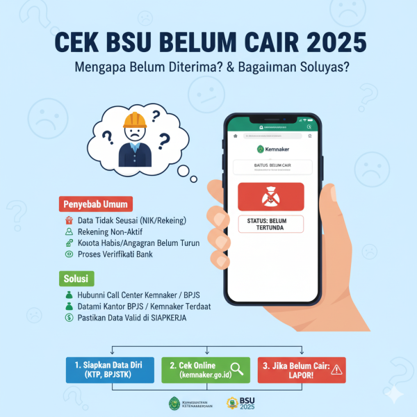 A2: Lakukan cek BSU belum cair 2025 melalui website resmi Kemnaker atau aplikasi BPJSTKU, atau datangi kantor Disnaker.