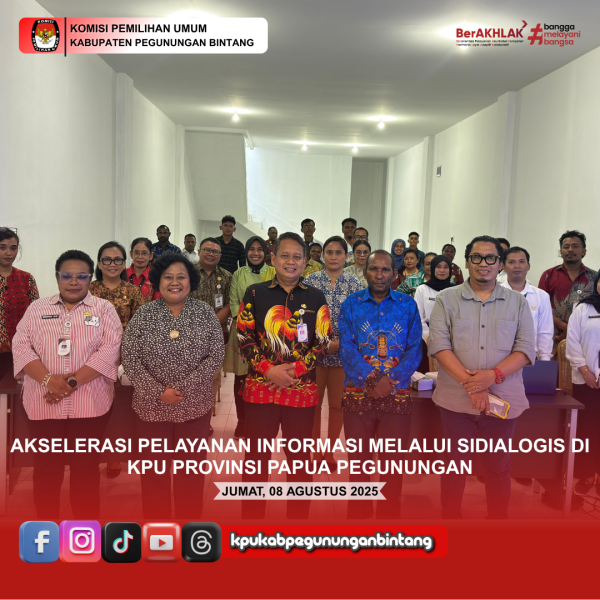 Komisi Pemilihan Umum Kabupaten Pegunungan Bintang Tengah mengikuti sosialisasi Akselerasi Pelayanan Informasi Publik melalui Sidialogis di Lingkungan KPU Provinsi Papua Pegunungan pada 08-09 Agustus 2025 bertempat di KPU Kabupaten Pegunungan Bintang dan KPU Provinsi Papua Pegunungan.