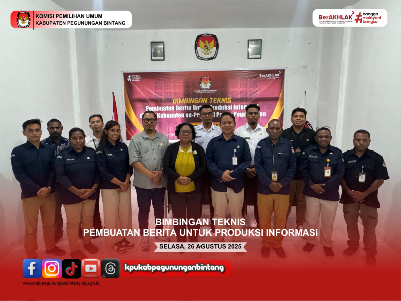 Komisi Pemilihan Umum (KPU) Provinsi Papua Pegunungan melaksanakan Bimbingan Teknis (Bimtek) Pembuatan Berita kepada jajaran sekretariat KPU provinsi dan KPU kabupaten se-Provinsi Papua Pegunungan. Bimtek ini digelar di Kantor Perwakilan KPU Pegunungan Bintang, Abepura, Kota Jayapura, Papua, Selasa, 26 Agustus 2025.